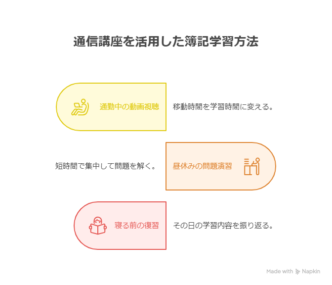 - 通信講座を活用し、通勤時間や昼休みなどのスキマ時間を有効活用することが、働きながらの学習成功の鍵です。